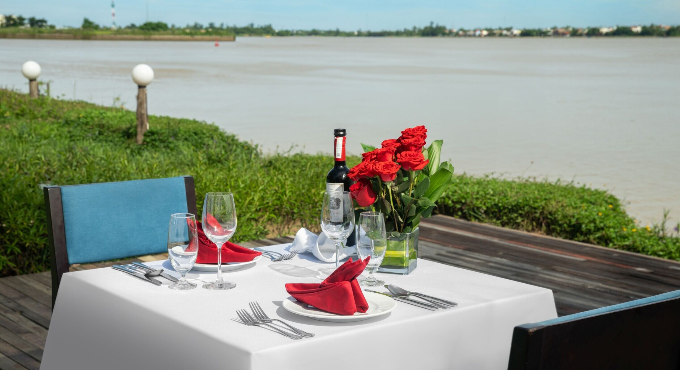 Bàn ăn riêng tư, ấm cúng được trang trí với nến và hoa