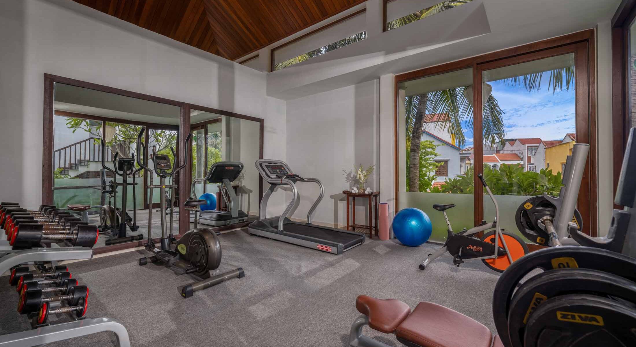 Phòng tập thể dục tiện lợi các thiết bị cơ bản từ máy chạy bộ đến tạ nâng, để bắt đầu ngày mới khỏe khoắn bên bờ cây xanh mát.